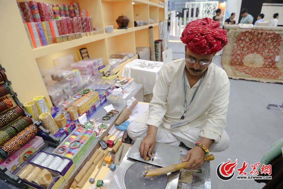 7號館“一帶一路·國際館”呈現(xiàn)出中西文化交相輝映,古老技藝與現(xiàn)代創(chuàng)意激烈碰撞的場景。圖為印度展區(qū)一位印度工匠盤膝而坐,手持木棒在爐子上來回翻滾,制作手環(huán)。大眾網(wǎng)記者 王長坤 攝
