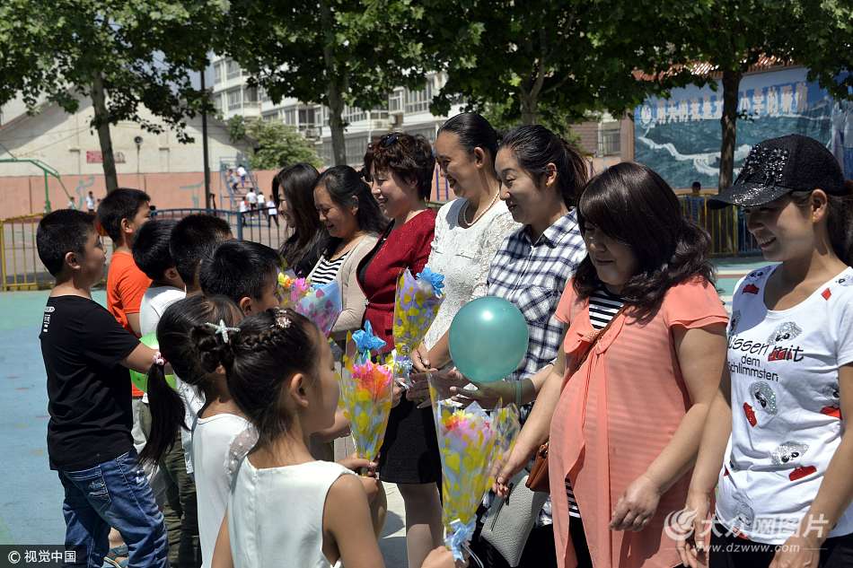 2017年5月12日,在山東聊城北順小學(xué),小學(xué)生給媽媽獻(xiàn)上做的康乃馨表達(dá)感恩之情。