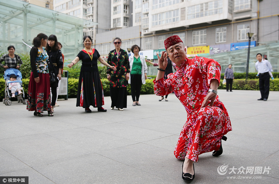 2017年5月15日,西安,70后石榮穿著漂亮的花衣服高跟鞋教大媽們跳新疆舞。大媽們都說她們的男老師跳女步嫵媚跳男步陽剛。