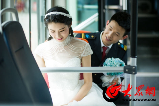 大眾網(wǎng)濟(jì)南5月21日訊 “521”是個特殊的日子,意味著“我愛你”。今天上午,公交165路停車場站內(nèi)一片歡聲笑語,駕駛員趙磊正在拍攝婚紗照。