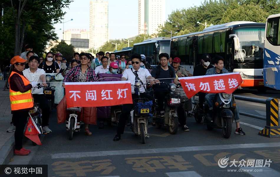 2017年5月25日,濟(jì)南,經(jīng)十路多個(gè)路口的非機(jī)動(dòng)車道,有數(shù)十名大媽組成的交通志愿者身穿橘黃色馬甲,手持小紅旗站在路口處,當(dāng)非機(jī)動(dòng)車道顯示紅燈時(shí),大媽飛快的拉起帶有“不闖紅燈”標(biāo)志的繩子,擋在道路中央,阻攔住意圖闖紅燈的騎車市民。