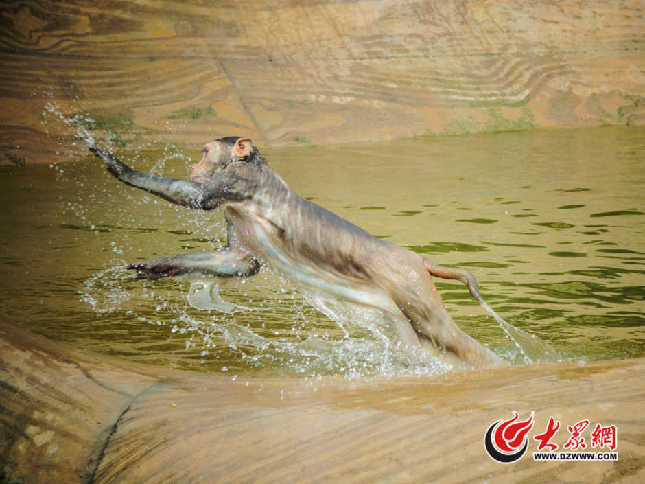 5月28日,山東濟(jì)南繼續(xù)高溫天氣,最高氣溫達(dá)到37℃,在濟(jì)南野生動(dòng)物世界里,動(dòng)物們喜過(guò)“潑水節(jié)”,老虎、大象、猴子等動(dòng)物沖涼泡澡消暑降溫。圖為一只獼猴在水池中嬉水納涼。