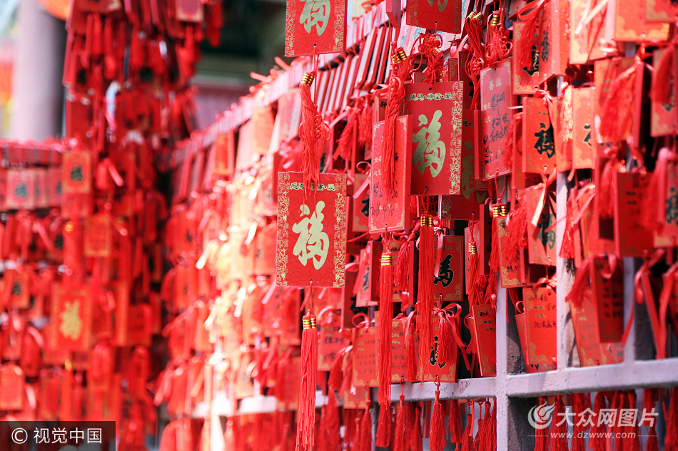 2017年5月28日,在山東泰安岱廟內一大典前,兩側約30米長的紅色欄桿上,密密麻麻的掛滿了游人祈福用的紅色福字木牌,木牌的背面寫滿了祝福的短語。臨近端午,不少游人特意選擇來岱廟寫福牌,祈福牌成為岱廟內一道亮麗風景線。