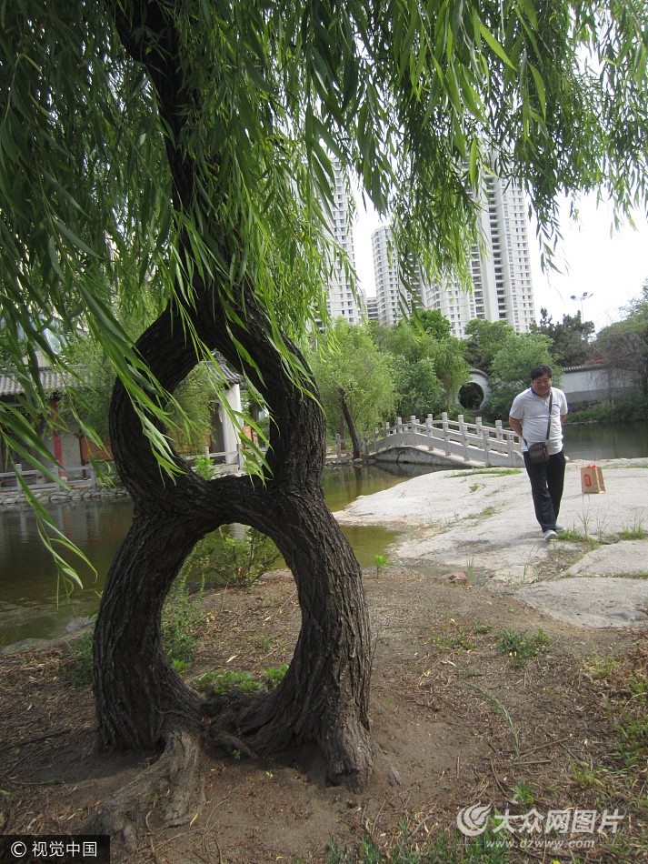 2017年06月03日,山東省日照市,山海天旅游度假區(qū)魏園內(nèi),一棵柳樹樹干像一個(gè)“葫蘆”,又似阿拉伯?dāng)?shù)字“8”。奇特的形狀吸人著眾多的市民前來參觀。