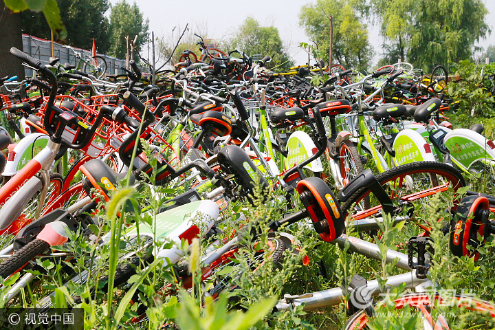 2017年6月20日,河南鄭州高新區(qū)一個長滿荒草的院子里,無序地擺放了各家共享單車公司的數(shù)百輛車子。