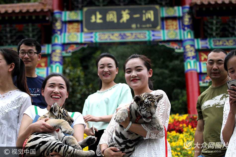 2017年6月22日,河南洛陽(yáng)伏牛山地質(zhì)公園雞冠洞園區(qū),姑娘們帶著倆老虎遛彎散步,小老虎們十分溫順,模樣呆萌可愛(ài),有時(shí)還會(huì)和大家玩耍。