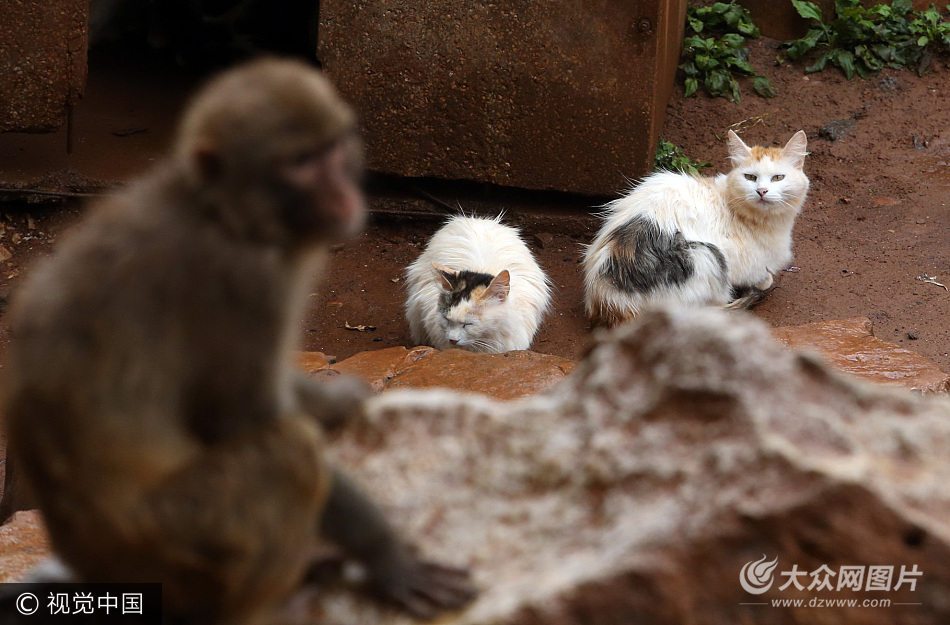 2017年6月27日,昆明,“貓保安”和“原住民”猴子和睦相處。