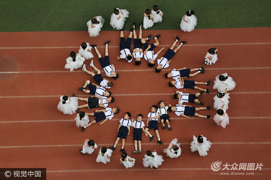 2017年6月27日,西安一幼兒園組織即將畢業(yè)的孩子們?cè)诓賵?chǎng)上擺出創(chuàng)意新穎的圖案拍攝個(gè)性畢業(yè)照,留下童年的美好回憶。