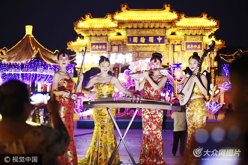 2017年6月30日,河南開封一景區(qū)門口迎來了除游客之外的新來客,四位身著中國風(fēng)旗袍的美女大學(xué)生在此開起了小型演奏會,引得眾人圍觀,一些大媽看后爭相與美女們合影。