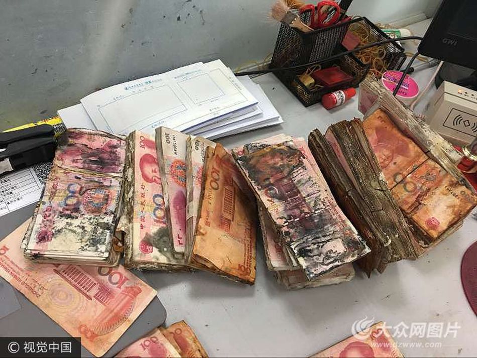 馬女士把錢拿到銀行兌換時(shí),這些發(fā)霉的錢散發(fā)出的惡臭熏得一位工作人員當(dāng)場(chǎng)干嘔,另一位工作人員在清點(diǎn)了約10個(gè)小時(shí)后,因?yàn)榉次覆坏貌淮魃峡谡。為了清理這筆錢,銀行先后投入6名員工,用了近11個(gè)小時(shí)來進(jìn)行分揀、比對(duì)甚至拼接。最終的結(jié)果是:銀行的工作人員為客戶兌換回來了19.395萬元。
