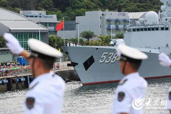 大眾網(wǎng)青島7月7日訊(通訊員 張剛 張凱)7月7日上午,正在執(zhí)行跨區(qū)機動訓練任務的中國人民解放軍海軍航母編隊抵達香港,參加香港回歸祖國暨中國人民解放軍進駐香港二十周年慶;顒,受到香港特區(qū)政府和民眾熱烈歡迎。香港特區(qū)政府在昂船洲軍營舉行隆重歡迎儀式,行政長官林鄭月娥率特別行政區(qū)政府主要官員出席儀式。全國政協(xié)副主席董建華出席歡迎儀式,登上導彈驅逐艦銀川艦參觀,并檢閱該艦儀仗隊。