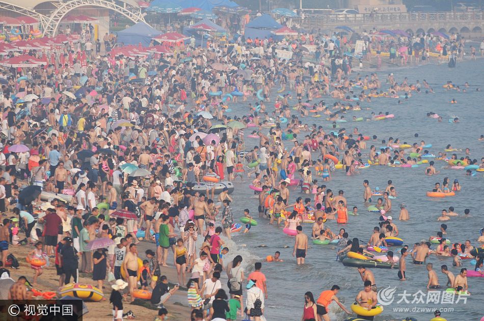 2017年7月12日,為農(nóng)歷“入伏”天氣,山東省青島市升至30℃,第一海水浴場(chǎng)迎來數(shù)萬游客“下餃子”避暑納涼。