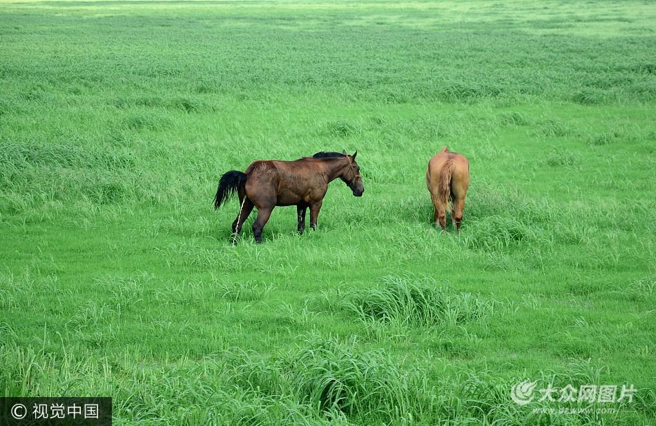 2017年7月24日,山東濰坊市,流經(jīng)濰坊壽光市的大型河流彌河出現(xiàn)斷流,河床裸露出來,河底長滿野草,遠遠望去像“大草原”一般。