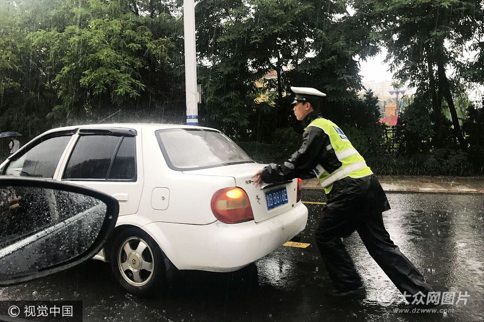 2017年7月31日上午,青島市黃島區(qū)發(fā)布暴雨藍(lán)色預(yù)警,當(dāng)時(shí)大雨如注。8時(shí)14分,在黃島區(qū)長(zhǎng)江中路,一位市民的汽車(chē)在暴雨中熄火,停在路中間。為了防止熄火車(chē)輛阻礙交通和可能引發(fā)的交通事故,在路口執(zhí)勤的交警三中隊(duì)協(xié)警劉超冒著如注的大雨,獨(dú)自一人將熄火車(chē)輛推到路邊安全地帶。