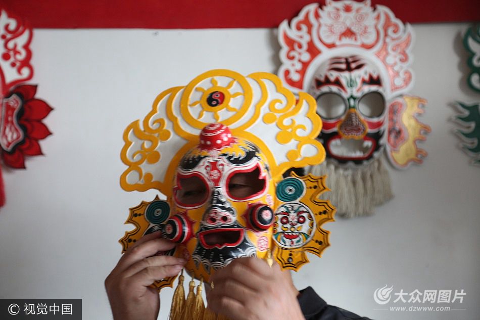2017年8月1日,在山東濟(jì)南天橋區(qū)萬盛街社區(qū),40多歲的侯志新師傅在家中掛忙了數(shù)百個候氏社火臉譜。侯師傅是第六代氏社火臉譜傳人,稱自己十分癡迷畫社火臉譜,10余年時間已在家中畫了有1萬余個社火臉譜,并且免費收徒都有千余名了。
