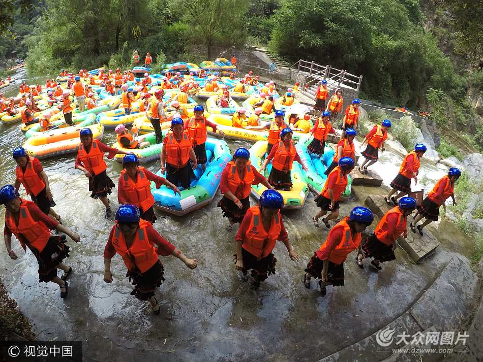 2017年8月16日,秋老虎發(fā)威高溫難耐,河南盧氏豫西大峽谷漂流游客有增無減,漂流河道堵成長龍,大媽們把皮筏艇拉到淺灘,開始激情四射的水中跳起廣場舞,還有人現(xiàn)場放音樂。大媽們身穿黑色短裙踩著音律的節(jié)奏、扭動著濕漉漉身軀翩翩起舞,動作整齊劃一,似出水芙蓉。