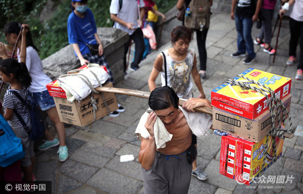 泰山挑夫送130斤飲料上山 每斤賺3毛錢