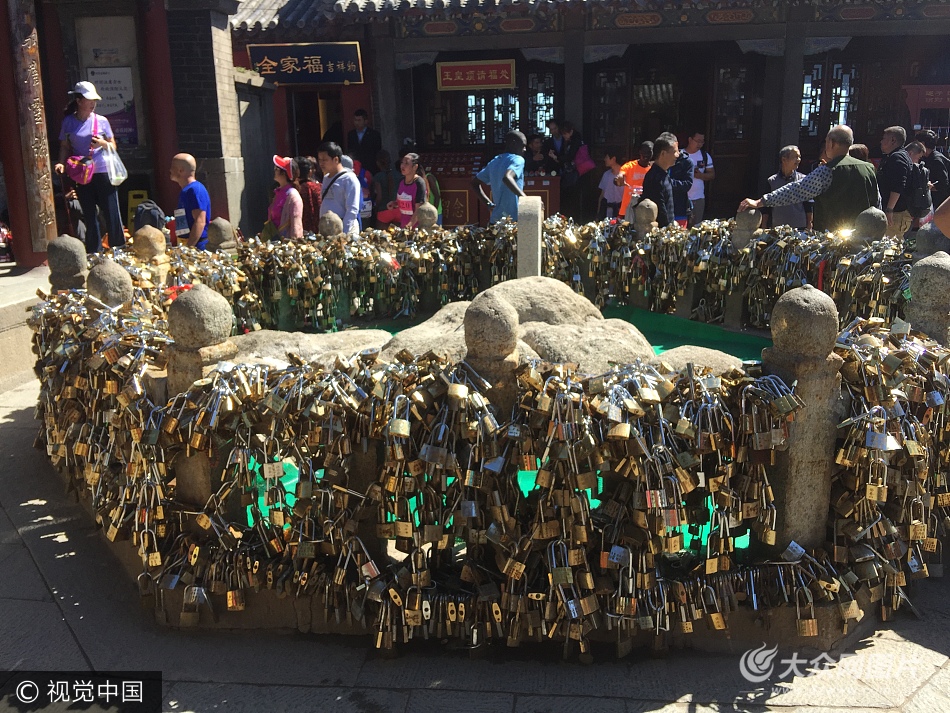 2017年9月7日,山東泰安,在泰山玉皇頂,泰山極頂1545米石碑外圍的護(hù)欄上被游客掛滿了各式連心鎖,鎖具上大都刻有祈福家人平安健康,財(cái)源廣進(jìn)的祈福語,圍欄內(nèi)的山石上同樣扔滿了硬幣,在陽光的照射下掛滿上萬鎖具的護(hù)欄金碧輝煌。