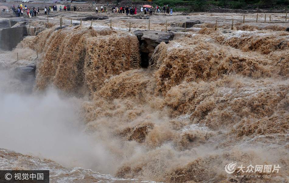 2017年9月8日,山西臨汾,游客在山西吉縣黃河壺口瀑布游覽拍照。受近日上游降雨影響,黃河晉陜峽谷水量持續(xù)保持在每秒八百立方左右,壺口瀑布形成壯美瀑布群,氣勢磅礴,吸引了眾多游客。