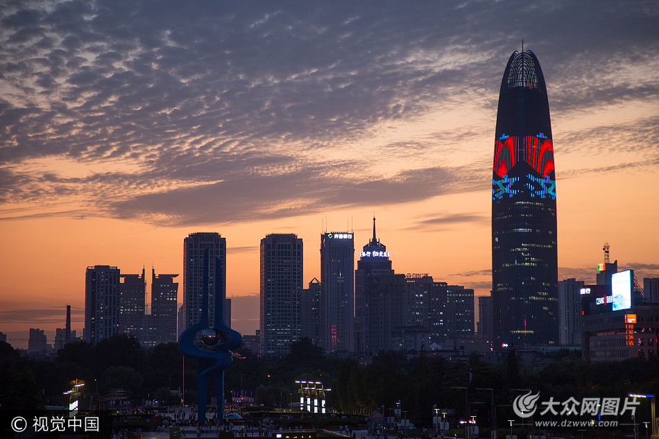 初秋的傍晚,濟(jì)南還保持在30度左右的氣溫。傍晚時(shí)分,西邊天空突然出現(xiàn)火燒云現(xiàn)象。城市建筑在火燒云的背景里格外突出。