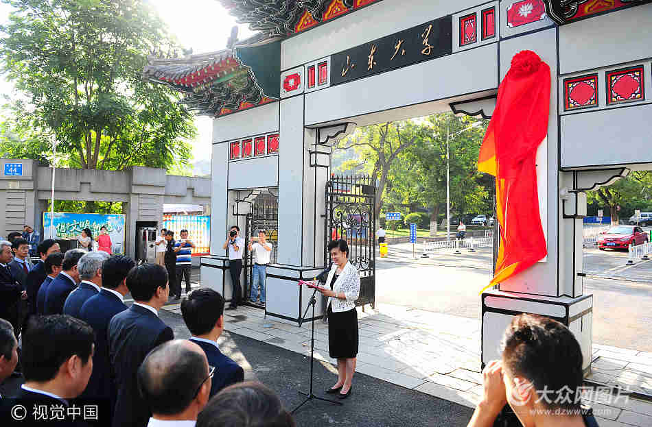 山東大學(xué)齊魯醫(yī)學(xué)院掛牌儀式9月21日在山東大學(xué)趵突泉校區(qū)校友門(mén)前舉行。圖為山東大學(xué)黨委書(shū)記郭新立(前右)、山東大學(xué)副校長(zhǎng)、齊魯醫(yī)學(xué)部部長(zhǎng)陳子江(前左)為齊魯醫(yī)學(xué)院揭牌。 潘炳(山東分社)/中新社/視覺(jué)中國(guó)