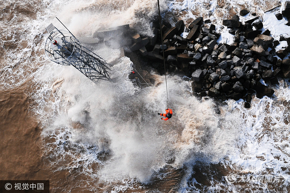 2017年10月2日,山東東營(yíng),交通運(yùn)輸部北海救助局所屬的北海第一救助飛行隊(duì)緊急出動(dòng)專(zhuān)業(yè)救助直升機(jī),營(yíng)救被困海中的遇險(xiǎn)者。國(guó)慶小長(zhǎng)假期間,山東東營(yíng)一海釣愛(ài)好者本想借著假期出海垂釣,沒(méi)曾想由于玩的太過(guò)投入,漲潮后被困在壩頭,不得不求助海上搜救中心。