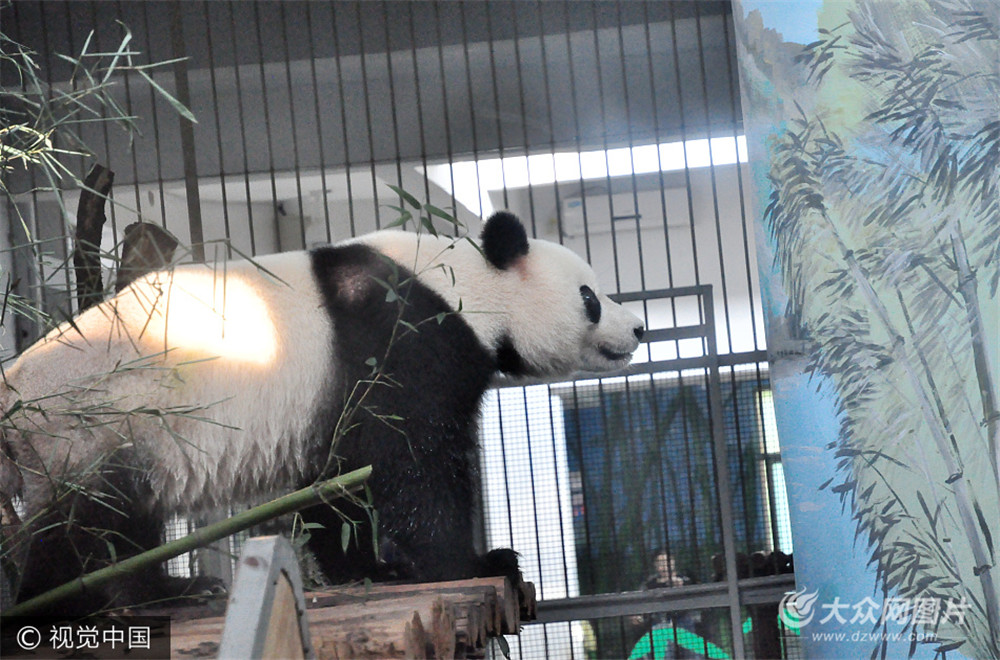 2017年10月6日,濟(jì)南,熊貓雅吉帶來超高人氣,適應(yīng)良好屢現(xiàn)倒立高難度動作。國慶前夕,熊貓雅吉來到濟(jì)南后融入環(huán)境適應(yīng)性好,短暫休整后和濟(jì)南市民見面,濟(jì)南動物園為雅吉制定了每天的展示時(shí)間,并且選擇了室內(nèi)環(huán)境,熊貓館在假期也成了人氣最高展館。雅吉在當(dāng)日的見面時(shí)間內(nèi)極其活躍,不時(shí)做出倒掛、倒立等高難度動作,顯示了良好身體狀態(tài)。每天吸引超萬人一睹其風(fēng)采。