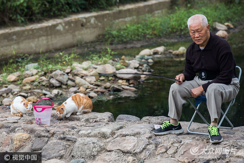 2017年10月11日消息,每天早上,家住浙江省浦江縣虞宅鄉(xiāng)一鄉(xiāng)村里的張若梓老人會(huì)去家旁邊的小溪里釣魚。這是他一輩子的愛好,一天釣兩三個(gè)小時(shí)的魚,也許只能釣到兩三條,有時(shí)又把魚兒給放了。如今,每天他在釣魚時(shí),旁邊有了伴,幾只村里的流浪貓會(huì)一直守護(hù)在一旁,這樣的時(shí)光已經(jīng)持續(xù)了幾個(gè)月。