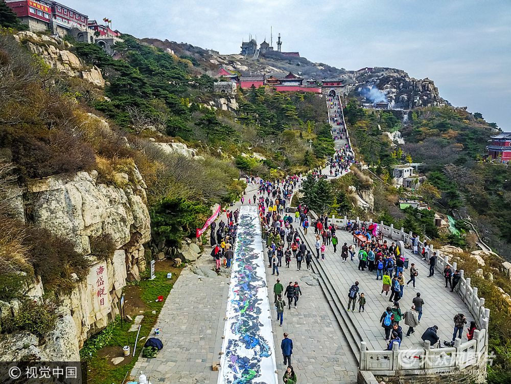 2017年10月14日,在泰山之巔天街上,袁海龍等齊魯名家運用潑墨、點染、勾勒等技巧,現(xiàn)場一同繪制了長達56米的巨幅山水長卷《大美泰山》,令游人大飽眼福。