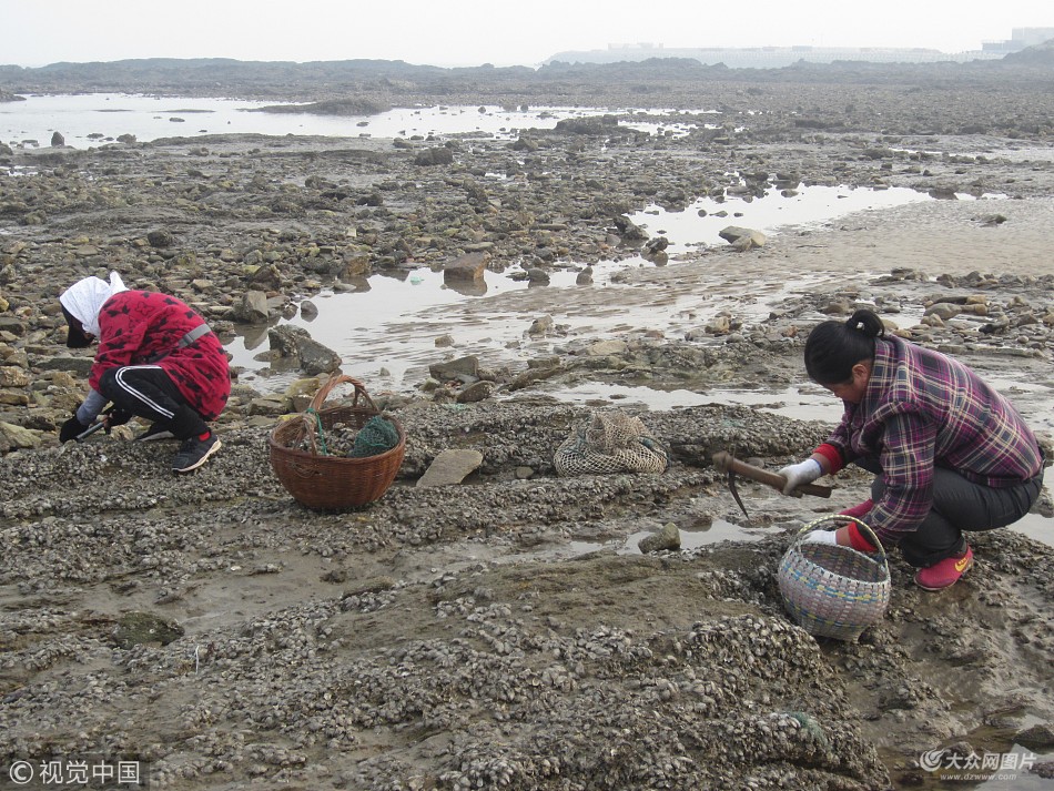 017年11月07日,農(nóng)歷立冬,山東日照,山海天旅游度假區(qū)張家臺(tái)海濱,退潮后的礁石上附著大量個(gè)大味美的牡蠣。人們爭相鏟挖,不多時(shí)個(gè)個(gè)滿載而歸。正在挖牡蠣的人們。