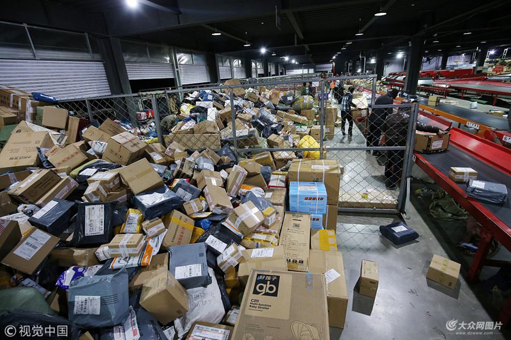 2017年11月12日,濰坊市一家快遞公司分揀中心工作人員正在分揀堆積如山的貨件。當(dāng)日,來自全國各地的“雙十一”貨件大批運抵濰坊市區(qū)各家快遞公司分揀中心,快遞公司工作人員都有條不紊地投入到分揀貨件之中,確保將貨件安全準(zhǔn)時的送達到客戶手中。