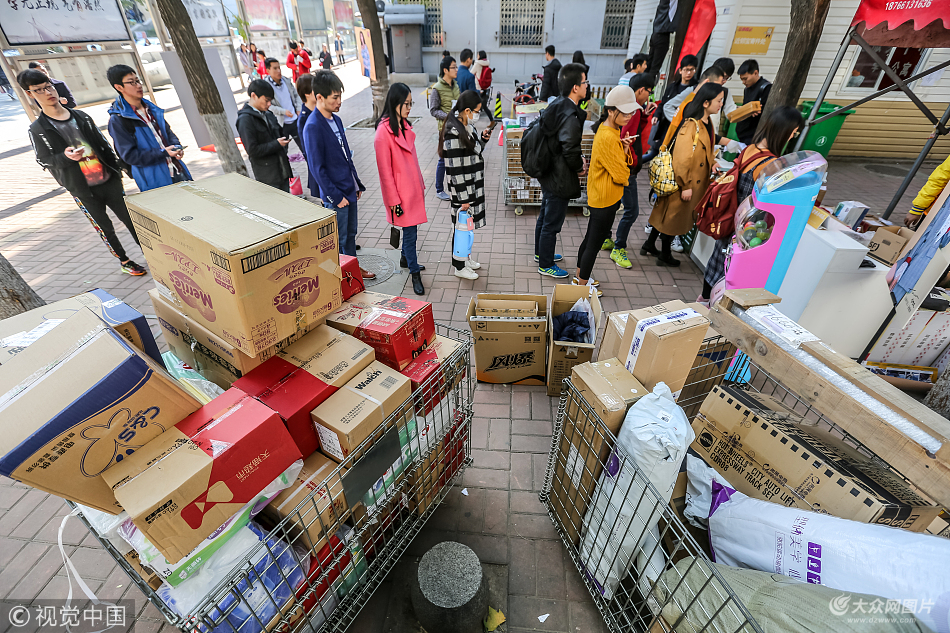 2017年11月13日,在山東大學(xué)中心校區(qū),大學(xué)生們排隊(duì)在宿舍樓附近一處快遞收發(fā)點(diǎn)內(nèi)領(lǐng)取包裹。隨著雙十一全民購(gòu)物狂歡的收尾,大批快遞也隨之涌入校園,眾多代收點(diǎn)天天“爆棚”。工作人員在堆積如“小山”的包裹里清點(diǎn)貨物,近幾天每日都有上萬(wàn)件的數(shù)量。