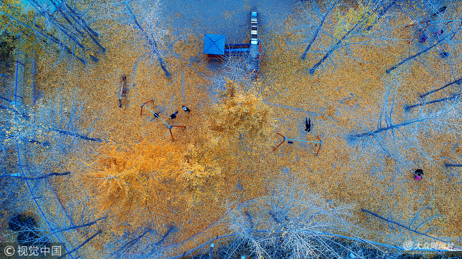 2017年11月18日,山東省濟南市,泉城迎來立冬之后首個寒潮天氣,最低氣溫降至-3.1℃,一夜寒風(fēng)吹凈了空氣中的污染物,帶來了優(yōu)質(zhì)通透的藍天,讓樹葉落滿地。在森林公園,銀杏葉全部飄落,形成金黃色的地毯,夕陽西下時,滿園金黃如夢如幻。