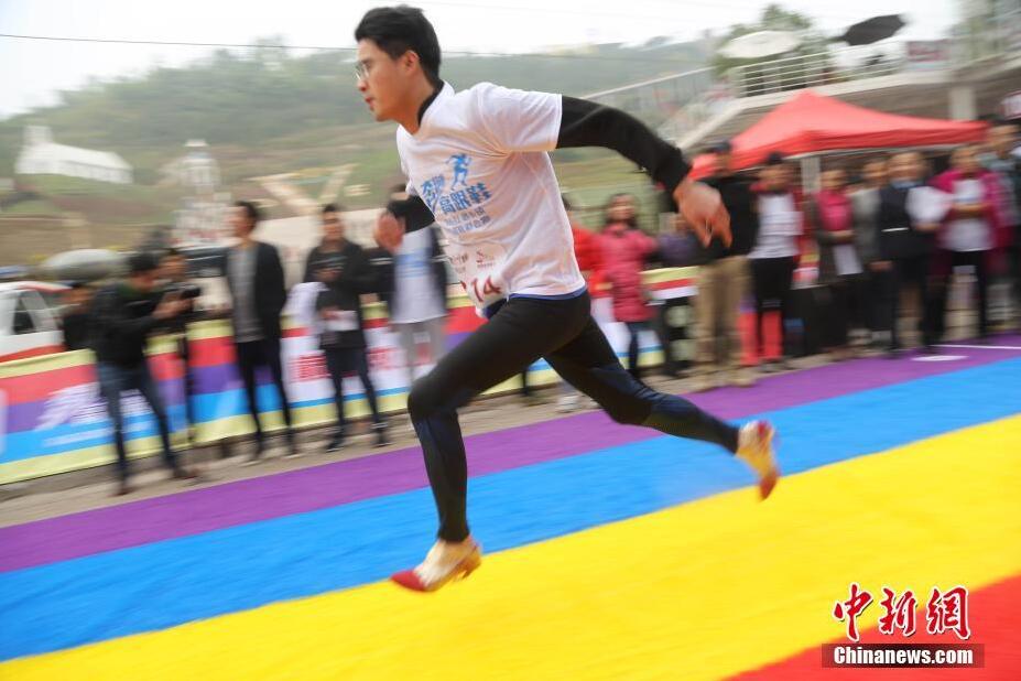 11月25日,重慶涪陵紅酒小鎮(zhèn)第四屆高跟鞋彩色跑開跑,吸引了不少男士穿著高跟鞋參賽。據(jù)悉,此次彩色跑的比賽項(xiàng)目分別為百米跑男女組、百米接力賽、彩色親子跑、登山跑男女組。楊孝勇 攝