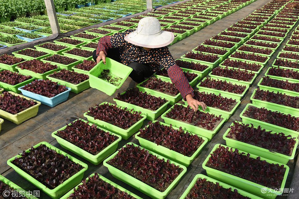 2017年12月4日,山東臨沂,沂南縣浩穎蔬菜種植專業(yè)合作社的農(nóng)民在大棚里管理盆栽蔬菜。