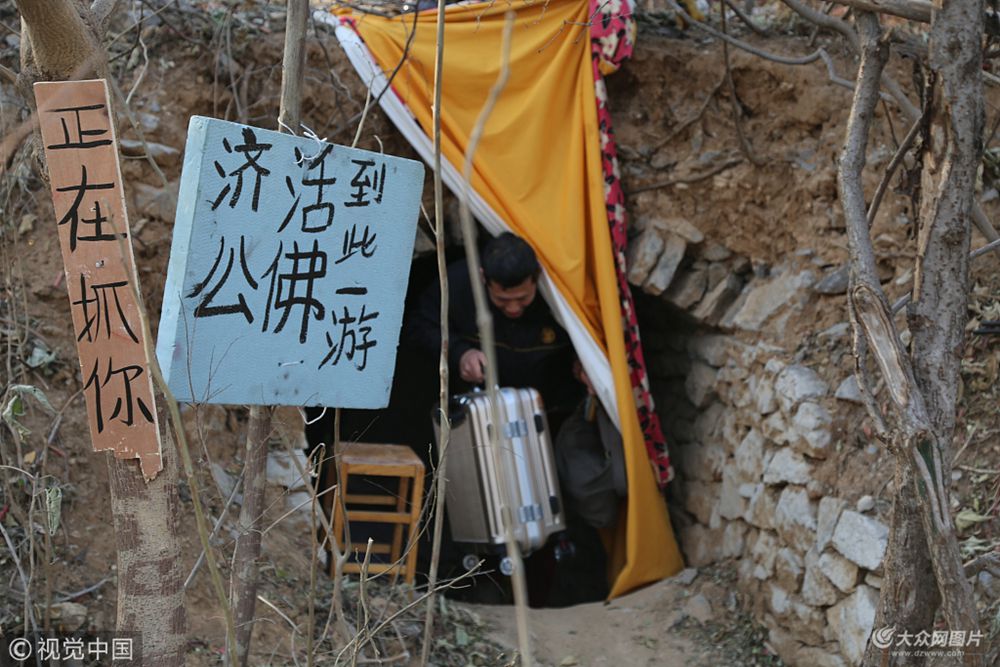 濟(jì)南市中區(qū)陽光舜城小區(qū)附近有座臥虎山,半山腰上有處洞穴。最近幾日,幾位常來山上鍛煉的市民發(fā)現(xiàn)洞穴里多了位“主人”,“有個小伙子在洞里支了床、簾子、桌子,像是住下了,大冷天的讓人不放心。”