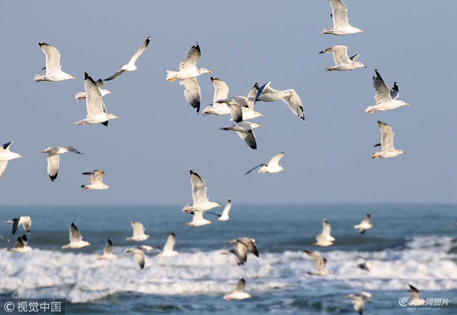 2017年12月8日,山東煙臺(tái)。入冬以來(lái),大批繁殖于寒帶,向南遷徙過(guò)冬的海鷗聚集在山東煙臺(tái)辛安河入海口附近棲息覓食,翻飛嬉戲,場(chǎng)面蔚為壯觀。