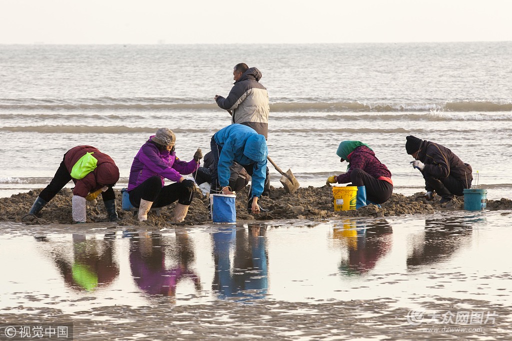2017年12月9日,山東煙臺市區(qū)東部黃海娛樂城附近海域,民眾趁著落潮趕!疤詫殹。入冬以來的幾場雪后,煙臺氣溫已降至零攝氏度以下,到海濱趕海的民眾趁著潮水走低,在鏡面一樣的海灘上挖蛤、釣蟶子、撿海螺,繪就一幅幅嚴冬海灘的別樣風景。近年來,當?shù)夭粩喔纳坪Q笊鷳B(tài)環(huán)境,促進了魚類、貝類等的自然繁殖生長,煙臺榮獲“全國海洋生態(tài)環(huán)境示范城市”稱號。 肖寧(山東分社)/中新社/視覺中國