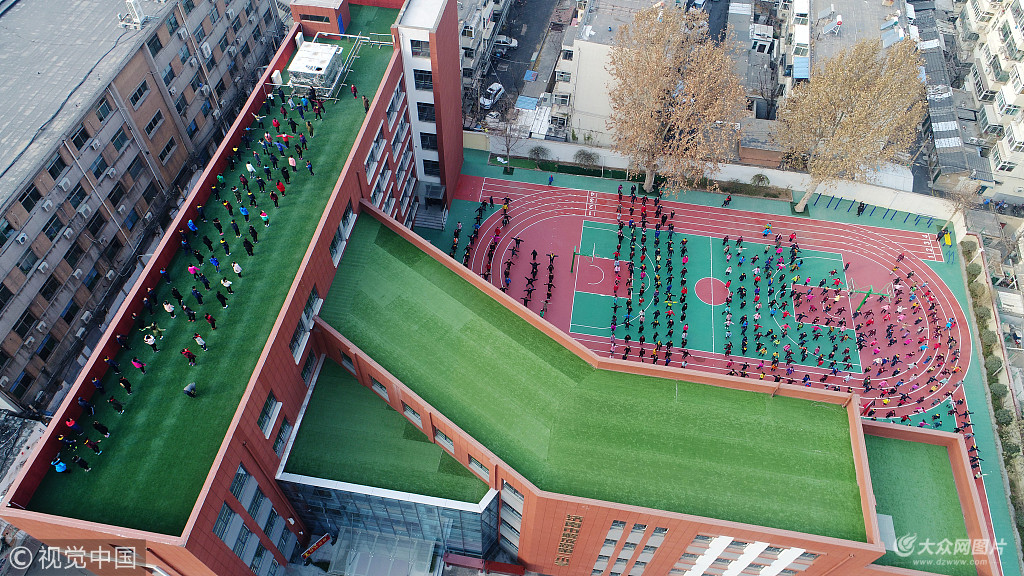 2017年12月13日,山東省濟南市,在歷山東路北首的濟南解放路第二小學(xué),上午10點課間操期間,六年級3個班的學(xué)生來到教學(xué)樓五樓平臺,在大約300平方米的樓頂操場做課間操,其他一至五年級的學(xué)生則在校園的操場和過道內(nèi)做操。據(jù)了解,該校教學(xué)樓今年下半年重建完成啟用,由于校園面積有限,教學(xué)樓建設(shè)之初就將樓頂平臺設(shè)計為“空中操場”,地面鋪設(shè)了人工草地,四周圍墻高達1.6米,防止學(xué)生攀爬,做課間操期間有老師專門帶隊看管,確保學(xué)生的安全。