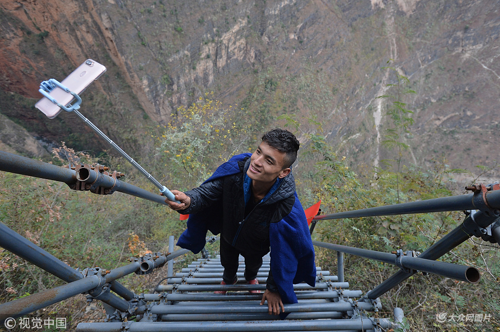 2017年12月15日,四川涼山,懸崖村的條件不僅“脫胎換骨”,村里還出了個“網紅”,每天攀爬在新修成的懸崖鋼梯上,為粉絲們直播自己的家鄉(xiāng),還收獲了數萬名粉絲。成都商報 王勤/視覺中國