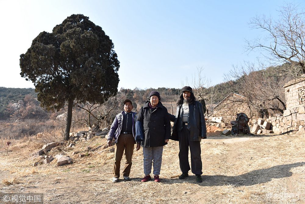 2017年12月16日,在山東省日照市嵐山區(qū)中樓鎮(zhèn)崔家峪村北的一座大山上,王京桂(音)和兩個(gè)兒子劉延靈(音,右)、劉延啟(音,左)在家門前一棵百年柏樹(shù)前合影。據(jù)劉延靈介紹,他們家世代在這座大山上居住,至今已經(jīng)7代了。