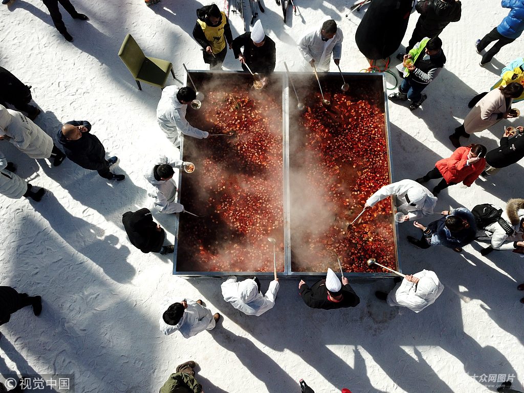 2017年12月24日,河南洛陽欒川伏牛山滑雪場,氣溫零下10攝氏度,數(shù)百民眾圍在一個邊長3米多面積達(dá)10平方米的自制"土火鍋"前,免費享用火鍋盛宴。據(jù)了解,這個超級土火鍋容納的湯料重達(dá)3噸,所用食材達(dá)上百種,包括當(dāng)?shù)厣絽^(qū)的土雞、山羊肉、炸丸子、山蘑菇、欒川豆腐、山野菜等。 王中舉(河南分社)/中新社/視覺中國
