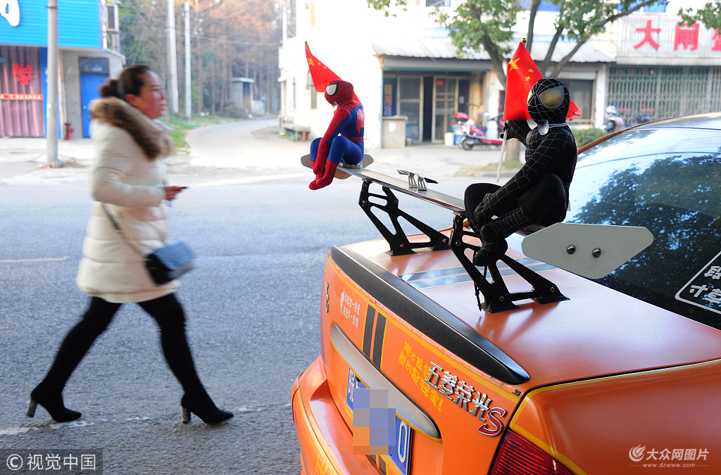 2017年12月19日,江蘇省蘇州市、徐州市等地的私家車(chē)車(chē)頂、車(chē)尾的“蜘蛛俠”、“鋼鐵俠”等卡通玩偶。最近兩年來(lái),在不少地方的私家車(chē)車(chē)頂,經(jīng)?吹讲簧偎郊臆(chē)主在車(chē)頂、車(chē)尾、后備箱蓋上安放造型各異的卡通玩偶,精心裝飾的卡通玩偶開(kāi)車(chē)上路著實(shí)吸引不少人的目光。成為一些私家車(chē)主尤其是年輕一族的新時(shí)尚。