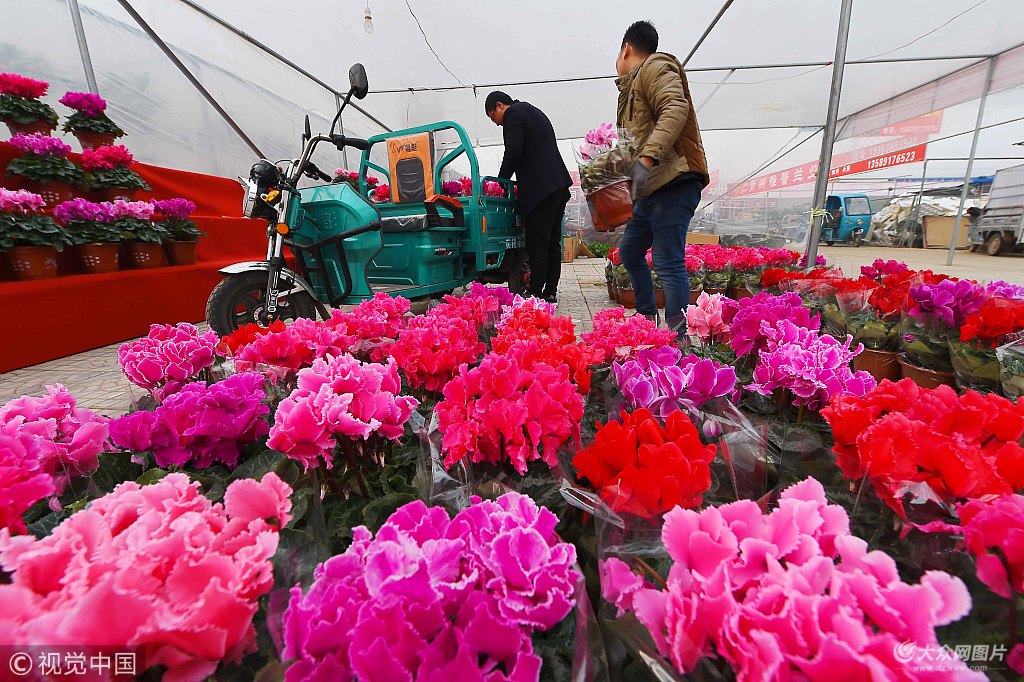 2017年12月29日,消費者在山東濰坊青州市黃樓街道花農(nóng)聯(lián)合舉辦的年宵花展銷會上選購花卉。