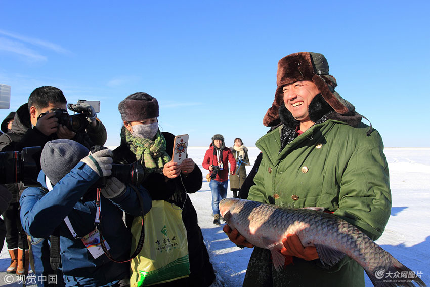 工作人員在展示冬捕上來的第一條魚。