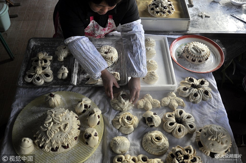 1月5日,迎來二十四節(jié)氣中的小寒。山東省茌平縣博平鎮(zhèn)大桑村的村民們從這一天開始制做花糕、做花饃的面食生意就忙碌紅火起來,來自北京、東北、新疆、內蒙等地的訂單也源源不斷的增加。當?shù)卮迕駛兘M成一起忙著加工制作花糕、花饃等面食以供應春節(jié)市場。作者:攝影師/視覺中國