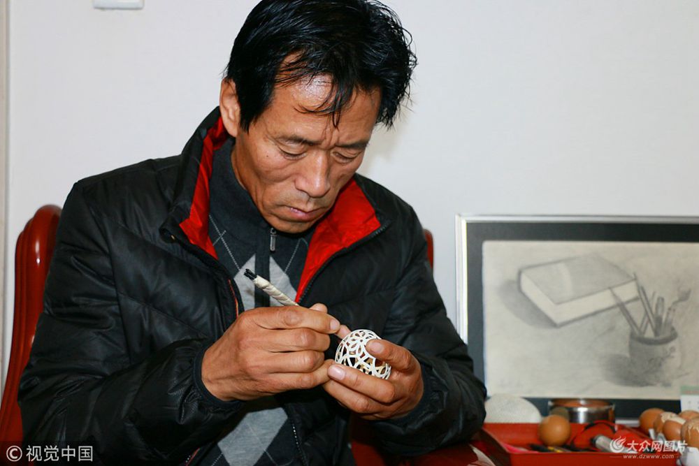 2018年1月7日,山東日照許家樓村,蛋雕師姜忠海正在蛋殼上雕刻。蛋雕是近年逐漸興起的一種民間手工藝品,它融合了繪畫與雕刻,以浮雕、陰雕、陽(yáng)雕、透雕、鏤空等雕刻手法進(jìn)行藝術(shù)創(chuàng)作。