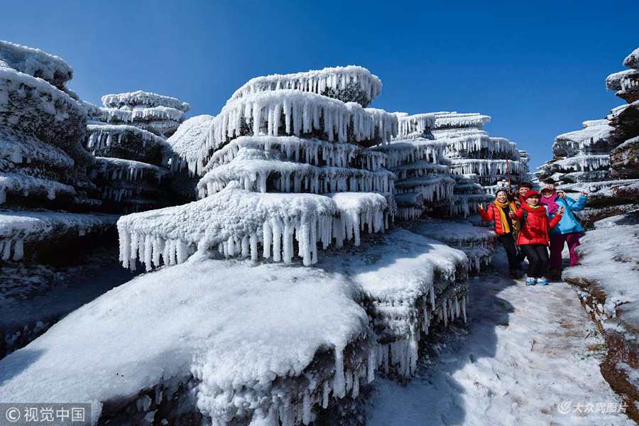 2018年1月9日,貴州省銅仁市松桃苗族自治縣盤石鎮(zhèn)當造村紅石林天氣轉(zhuǎn)睛。紅石林景區(qū)內(nèi)里層層疊疊、奇形怪狀的石林上吊著一排排冰掛、白雪皚皚與藍天相互輝映,美景如畫,吸引各地攝影愛好者和游客游覽觀光。