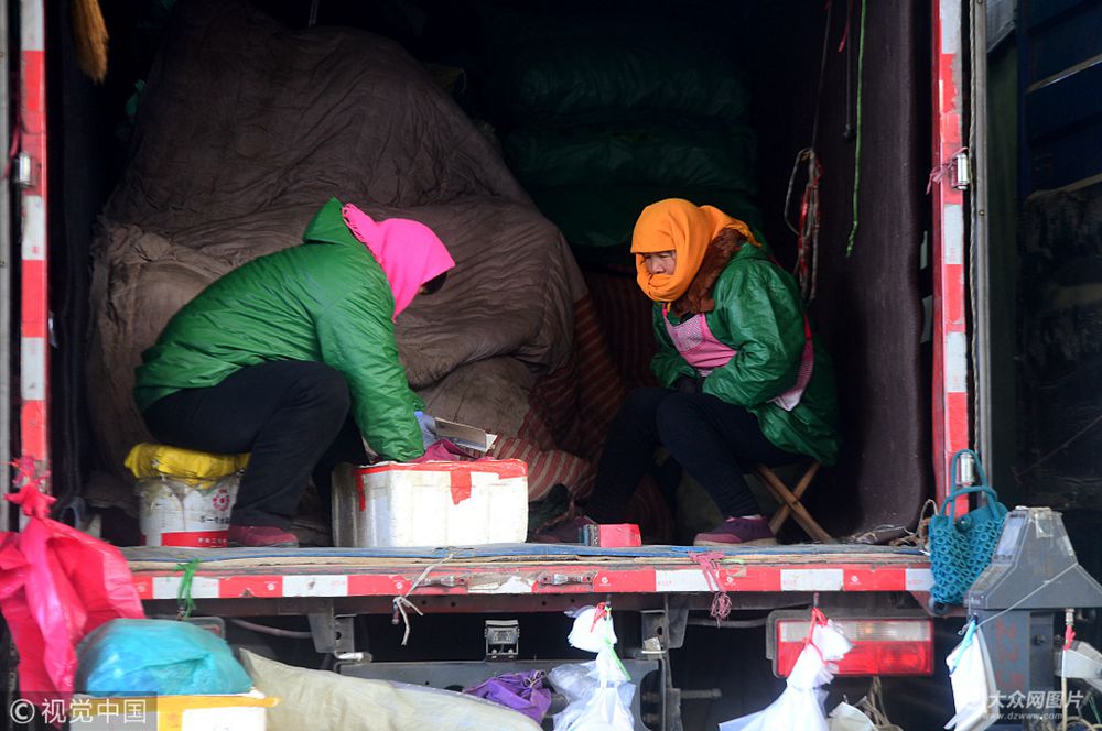 近日,泉城迎來寒潮天氣,最低氣溫降至-9℃,在濟南的蔬菜批發(fā)市場里,菜販們裹著好幾層棉衣,只露兩只眼睛,蜷縮在貨堆里取暖避寒!斑@個時候也不講啥好看不好看了,暖和最重要!辈素溦f,比人更嬌貴、更需要保暖的是蔬菜,大部分等待出售的綠葉青菜都蓋上了兩三層棉被。菜販們在低溫天氣里守候的菜攤前,一天最少7、8個小時。