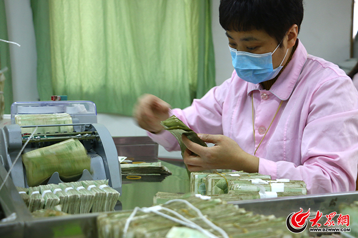 點(diǎn)鈔員清點(diǎn)完成后,100張?jiān)鸀橐话,質(zhì)檢員再進(jìn)行復(fù)點(diǎn)、驗(yàn)鈔 。實(shí)習(xí)生 趙宇 攝